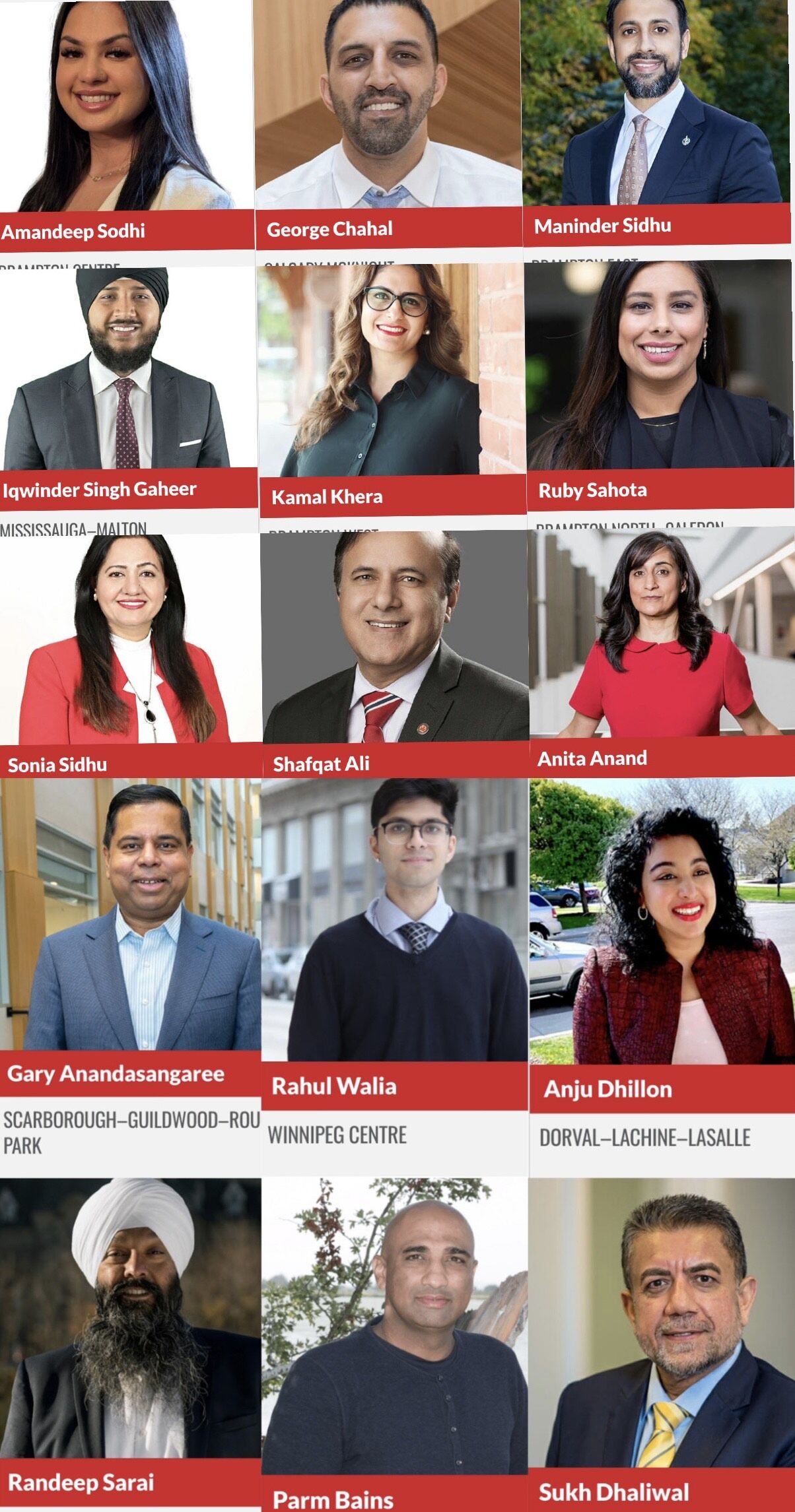 ਕੈਨੇਡਾ ਦੀਆਂ ਸੰਸਦੀ ਚੋਣਾਂ 2025 'ਚ ਵੱਖੋ-ਵੱਖਰੇ ਜ਼ਿਿਲਆਂ ਤੋਂ ਕੁੱਲ 45 ਭਾਰਤੀ ਉਮੀਦਵਾਰ ਖੜ੍ਹੇ ਹੋਏ ਹਨ ਜਿੰਨ੍ਹਾਂ 'ਚੋਂ 37 ਪੰਜਾਬੀ ਉਮੀਦਵਾਰ ਹਨ। ਲਿਬਰਲ ਪਾਰਟੀ 'ਚ ਕੁੱਲ 15 ਜਿੰਨ੍ਹਾਂ 'ਚ 13 ਪੰਜਾਬੀ ਹਨ ਅਤੇ 2 ਭਾਰਤੀ ਉਮੀਦਵਾਰ ਸ਼ਾਮਲ ਹਨ। ਬਰੈਂਪਟਨ ਸੈਂਟਰ ਤੋਂ ਅਮਨਦੀਪ ਸੋਢੀ, ਓਕਵਿਲ ਈਸਟ ਤੋਂ ਅਨੀਤਾ ਆਨੰਦ, ਡੋਰਵਲ ਲੈਚਿਨ ਲਸਾਲ ਤੋਂ ਅੰਜੂ ਢਿੱਲੋਂ, ਸਕਾਰਬਰੋ ਗੀਲਡਵੁੱਡ ਰੋਜ ਪਾਰਕ ਤੋਂ ਗੈਰੀ ਆਨੰਦਾਸੰਗਾਰੀ, ਕੈਲਗਰੀ ਮੈਕਨਾਈਟ ਤੋਂ ਜੀਓਰਜ਼ ਚਾਹਲ, ਮਿਸੀਸਾਗਾ ਮਾਲਟਨ ਤੋਂ ਇੱਕਵਿੰਦਰ ਗਹੀਰ, ਬਰੈਂਪਟਨ ਵੈਸਟ ਤੋਂ ਕਮਲ ਖਹਿਰਾ, ਬਰੈਂਪਟਨ ਈਸਟ ਤੋਂ ਮਨਿੰਦਰ ਸਿੱਧੂ, ਰਿੱਚਮੰਡ ਈਸਟ-ਸਟੀਵਸਟਨ ਤੋਂ ਪਰਮ ਬੈਂਸ, ਵਿਨੀਪੈਗ ਸੈਂਟਰ ਤੋਂ ਰਾਹੁਲ ਵਾਲੀਆ, ਸਰੀ ਸੈਂਟਰ ਤੋਂ ਰਨਦੀਪ ਸਰਾਏ, ਬਰੈਂਪਟਨ ਨੌਰਥ ਤੋਂ ਰੂਬੀ ਸਹੋਤਾ, ਬਰੈਂਪਟਨ- ਚਿਨਗੂਜ਼ੀ ਪਾਰਕ ਤੋਂ ਸ਼ਫਕਤ ਅਲੀ, ਬਰੈਂਪਟਨ ਸਾਊਥ ਤੋਂ ਸੋਨੀਆ ਸਿੱਧੂ, ਸਰੀ ਨਿਊਟਨ ਤੋਂ ਸੁੱਖ ਧਾਲੀਵਾਲ। ਜ਼ਿਕਰਯੋਗ ਹੈ ਕਿ ਇੰਨ੍ਹਾਂ 'ਚੋਂ ਕੁੱਝ ਉਮੀਦਵਾਰ ਪਹਿਲਾਂ ਵੀ ਚੋਣਾਂ ਜਿੱਤ ਚੁੱਕੇ ਹਨ। ਕਮਲ ਖਹਿਰਾ, ਰੂਬੀ ਸਹੋਤਾ, ਸੋਨੀਆ ਸਿੱਧੂ ਚੌਥੀ ਵਾਰ ਚੋਣ ਲੜ੍ਹ ਰਹੇ ਹਨ। 2015, 2019 ਅਤੇ 2021 ਦੀਆਂ ਚੋਣਾਂ ਇੰਨ੍ਹਾਂ ਨੇ ਜਿੱਤ ਹਾਸਲ ਕੀਤੀ ਸੀ। ਮਨਿੰਦਰ ਸਿੱਧੂ 2019, 2021 ਅਤੇ ਹੁਣ 2025 'ਚ ਤੀਸਰੀ ਵਾਰ ਚੋਣ ਲੜ੍ਹ ਰਹੇ ਹਨ।