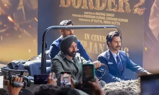 ਦੂਜੇ ਪਾਸੇ ਫਿਲਮੀ ਅਦਾਕਾਰ—ਸੰਨੀ ਦਿਓਲ, ਵਰੁਣ ਧਵਨ ਅਤੇ ਅਹਾਨ ਸ਼ੈੱਟੀ—ਇੱਕ ਖੁੱਲ੍ਹੀ ਜੀਪ ਵਿੱਚ ਸਵਾਰ ਹੋ ਕੇ ਰਾਜਿਆਂ ਵਾਂਗ ਹੱਥ ਹਿਲਾ ਰਹੇ ਹਨ।