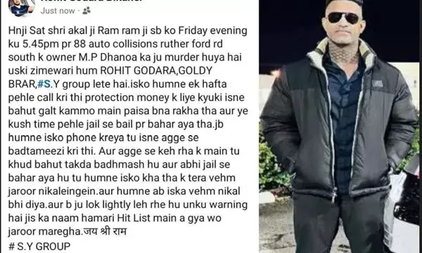 ਰੋਹਿਤ ਗੋਦਾਰਾ ਬੀਕਾਨੇਰ ਦੇ ਸੋਸ਼ਲ ਮੀਡੀਆ ਅਕਾਊਂਟ ਰਾਹੀਂ ਜਾਰੀ ਪੋਸਟ ਮੁਤਾਬਕ ਐਮ.ਪੀ. ਧਨੋਆ ਖੁਦ ਨੂੰ ਵੱਡਾ ਬਦਮਾਸ਼ ਦਸਦਾ ਸੀ ਅਤੇ ਉਸ ਦਾ ਵਹਿਮ ਕੱਢ ਦਿਤਾ। ਇਸ ਦੇ ਨਾਲ ਹੀ ਹੋਰਨਾਂ ਨੂੰ ਵੀ ਚਿਤਾਵਨੀ ਦਿਤੀ ਗਈ ਹੈ ਕਿ ਜਿਹੜੇ ਲੋਕ ਸਾਡੀਆਂ ਗੱਲਾਂ ਹਲਕੇ ਤੌਰ ’ਤੇ ਲੈ ਰਹੇ ਹਨ, ਉਨ੍ਹਾਂ ਦੇ ਨਾਂ ਹਿਟ ਲਿਸਟ ਵਿਚ ਸ਼ਾਮਲ ਕੀਤੇ ਜਾ ਰਹੇ ਹਨ। ਦੂਜੇ ਪਾਸੇ ਜੱਸਾ ਸਿੰਘ ਆਜ਼ਾਦ ਨਾਂ ਦੇ ਸੋਸ਼ਲ ਮੀਡੀਆ ਅਕਾਊਂਟ ਰਾਹੀਂ ਜਾਰੀ ਪੋਸਟ ਵਿਚ ਦਾਅਵਾ ਕੀਤਾ ਗਿਆ ਹੈ ਕਿ ਐਮ.ਪੀ. ਧਨੋਆ ਦੇ ਕਤਲ ਦੇ ਜ਼ਿੰਮੇਵਾਰੀ ਪ੍ਰਭ ਨਾਥ ਅਤੇ ਸੋਨੂ ਚੱਠਾ ਲੈਂਦੇ ਹਨ। ਇਹ ਕੰਮ ਗਗਨ ਅਤੇ ਆਕਾਸ਼ ਨੇ ਸਾਡੇ ਕਹਿਣ ’ਤੇ ਕੀਤਾ ਕਿਉਂਕਿ ਧਨੋਆ ਨਾਲ ਸਾਡੀ ਨਿਜੀ ਦੁਸ਼ਮਣੀ ਸੀ। ਧਨੋਆ ਨੇ ਸਾਡੀ ਜੈਗੁਆਰ ਗੱਡੀ ਨੂੰ ਅੱਗ ਲਾਈ ਅਤੇ ਇਸ ਨੂੰ ਕਈ ਵਾਰ ਵਾਰਨਿੰਗ ਵੀ ਦਿਤੀ ਗਈ। ਸੋਸ਼ਲ ਮੀਡੀਆ ਪੋਸਟ ਵਿਚ ਦਾਅਵਾ ਕੀਤਾ ਗਿਆ ਹੈ ਕਿ ਪਿਛਲੇ ਮਹੀਨੇ ਐਮ.ਪੀ. ਧਨੋਆ ਦੇ ਪਿਤਾ ਉਤੇ ਵੀ ਹਮਲਾ ਕਰਵਾਇਆ ਸੀ। ਜੱਸਾ ਸਿੰਘ ਆਜ਼ਾਦ ਦੇ ਸੋਸ਼ਲ ਮੀਡੀਆ ਰਾਹੀਂ ਜਾਰੀ ਪੋਸਟ ਵਿਚ ਰੋਹਿਤ ਗੋਦਾਰਾ ਦੀ ਜ਼ਿੰਮੇਵਾਰੀ ਨੂੰ ਝੂਠੀ ਕਰਾਰ ਦਿਤਾ ਗਿਆ ਹੈ। ਇਥੇ ਦਸਣਾ ਬਣਦਾ ਹੈ ਕਿ ਬਰੈਂਪਟਨ ਦੇ ਰਦਰਫੋਰਡ ਰੋਡ ਸਾਊਥ ਅਤੇ ਗਲਿਡਨ ਰੋਡ ਇਲਾਕੇ ਵਿਚ ਮਾਰੇ ਗਏ ਸ਼ਖਸ ਦੀ ਪਛਾਣ ਪੁਲਿਸ ਵੱਲੋਂ ਜਨਤਕ ਨਹੀਂ ਕੀਤੀ ਗਈ।