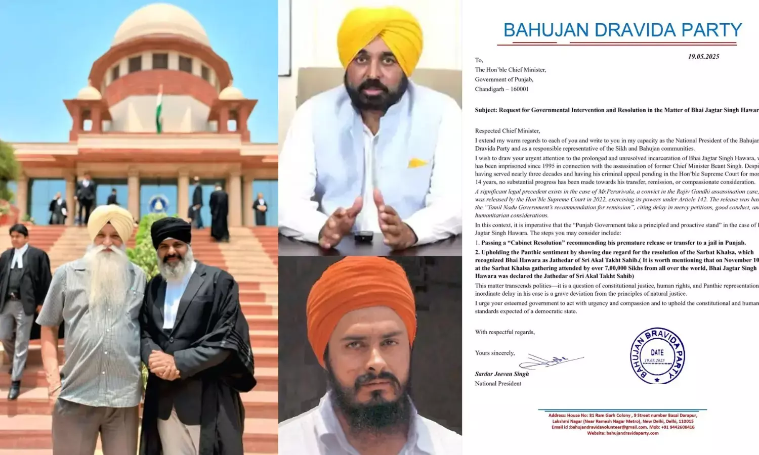 ਬਹੁਜਨ ਦ੍ਰਾਵਿਡਾ ਪਾਰਟੀ ਦੇ ਰਾਸ਼ਟਰੀ ਪ੍ਰਧਾਨ ਜੀਵਨ ਸਿੰਘ ਨੇ ਪੰਜਾਬ ਦੇ ਮਾਣਯੋਗ ਮੁੱਖ ਮੰਤਰੀ ਨੂੰ ਇਕ ਤੁਰੰਤ ਕਾਰਵਾਈ ਲਈ ਅਪੀਲ ਕੀਤੀ ਹੈ ਕਿ ਭਾਈ ਜਗਤਾਰ ਸਿੰਘ ਹਵਾਰਾ ਦੀ ਲੰਬੇ ਸਮੇਂ ਤੋਂ ਚੱਲੀ ਆ ਰਹੀ ਕੈਦ ਸਬੰਧੀ ਮਾਮਲੇ ਵਿੱਚ ਸਰਕਾਰ ਦਖਲ ਕਰੇ।