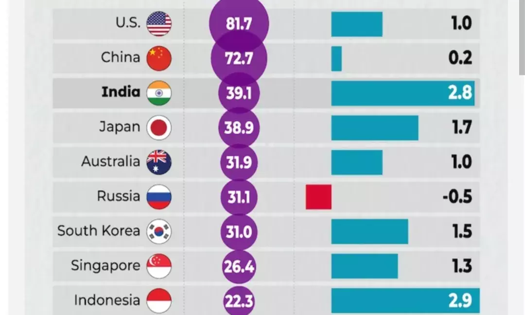 ਲੋਵੀ ਇੰਸਟੀਚਿਊਟ ਦੇ ਅਨੁਸਾਰ, ਭਾਰਤ ਨੇ ਇਸ ਸਾਲ 40 ਅੰਕ ਪ੍ਰਾਪਤ ਕੀਤੇ, ਜਦੋਂ ਕਿ 2024 ਵਿੱਚ ਇਹ ਅੰਕੜਾ 38.1 ਸੀ। ਇਸ ਵਾਰ, ਭਾਰਤ ਨੇ ਏਸ਼ੀਆ ਵਿੱਚ ਤੀਜੀ ਸਭ ਤੋਂ ਪ੍ਰਭਾਵਸ਼ਾਲੀ ਸ਼ਕਤੀ ਪ੍ਰਾਪਤ ਕੀਤੀ ਹੈ। ਸੰਯੁਕਤ ਰਾਜ ਅਤੇ ਚੀਨ ਪਹਿਲੇ ਸਥਾਨ 'ਤੇ ਆਪਣੀ ਸਥਿਤੀ ਬਣਾਈ ਰੱਖਦੇ ਹਨ। ਜਾਪਾਨ 38.8 ਅੰਕਾਂ ਨਾਲ ਚੌਥੇ ਸਥਾਨ 'ਤੇ ਹੈ, ਅਤੇ ਰੂਸ 32.1 ਅੰਕਾਂ ਨਾਲ ਪੰਜਵੇਂ ਸਥਾਨ 'ਤੇ ਹੈ। ਭਾਰਤ ਦਾ ਵਾਧਾ ਇਸਦੇ ਆਰਥਿਕ ਵਿਕਾਸ, ਫੌਜੀ ਮੁਲਾਂਕਣ ਅਤੇ ਖੇਤਰੀ ਪ੍ਰਭਾਵ ਦੀ ਮਜ਼ਬੂਤੀ ਨੂੰ ਦਰਸਾਉਂਦਾ ਹੈ।