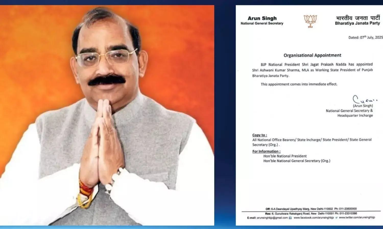 ਭਾਰਤੀ ਜਨਤਾ ਪਾਰਟੀ ਦੀ ਹਾਈਕਮਾਨ ਵੱਲੋਂ ਅਸ਼ਵਨੀ ਕੁਮਾਰ ਸ਼ਰਮਾ ਨੂੰ ਪੰਜਾਬ ਭਾਜਪਾ ਦਾ ਕਾਰਜਕਾਰੀ ਪ੍ਰਧਾਨ ਨਿਯੁਕਤ ਕੀਤਾ ਗਿਆ ਏ। ਭਾਜਪਾ ਦੇ ਕੌਮੀ ਪ੍ਰਧਾਨ ਜੇਪੀ ਨੱਡਾ ਵੱਲੋਂ ਜਾਰੀ ਪੱਤਰ ਵਿਚ ਲਿਖਿਆ ਗਿਆ ਏ ਕਿ ਵਿਧਾਇਕ ਅਸ਼ਵਨੀ ਕੁਮਾਰ ਸ਼ਰਮਾ ਨੂੰ ਭਾਰਤੀ ਜਨਤਾ ਪਾਰਟੀ ਪੰਜਾਬ ਰਾਜ ਦਾ ਕਾਰਜਕਾਰੀ ਪ੍ਰਧਾਨ ਨਿਯੁਕਤੀ ਕੀਤਾ ਜਾਂਦਾ ਹੈ।