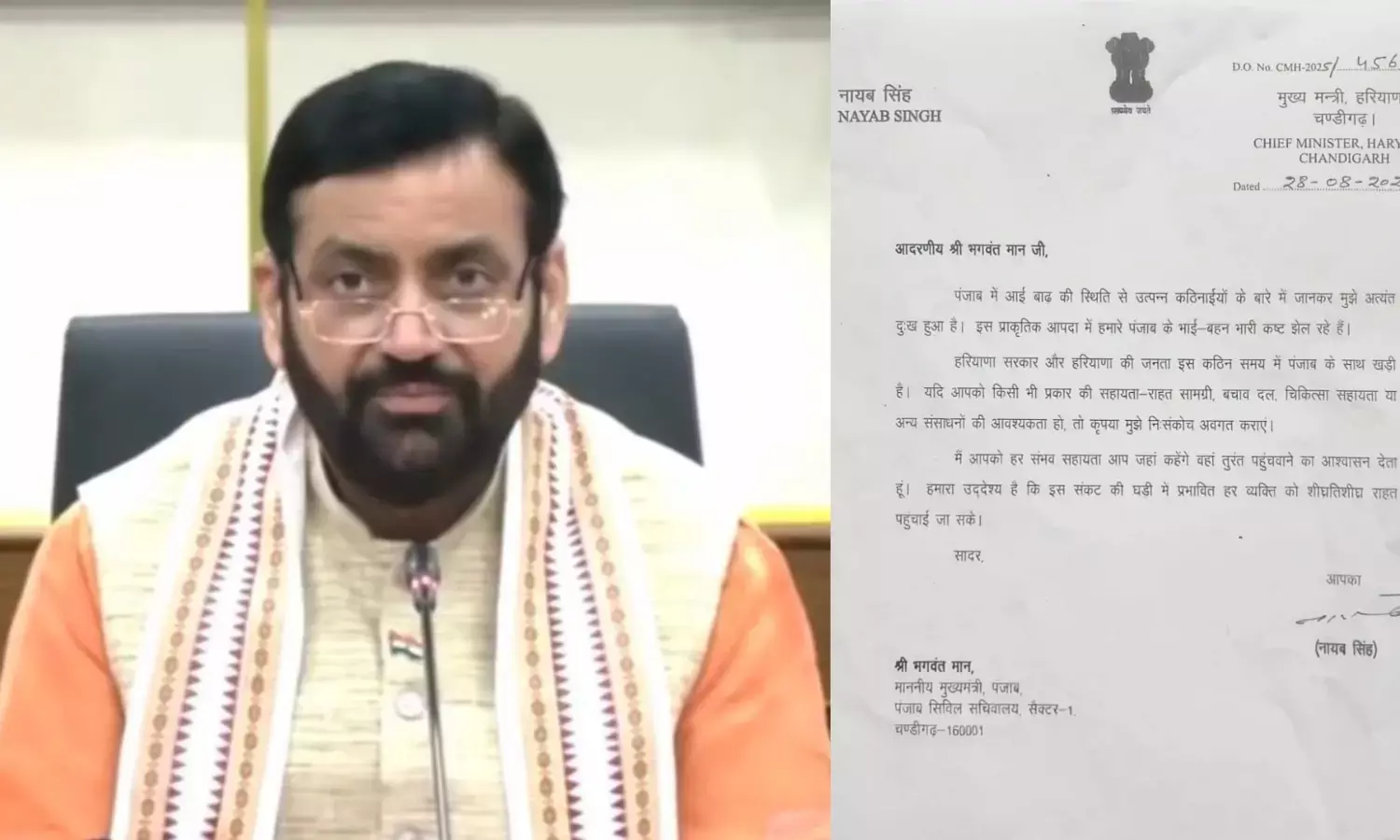 ਹਰਿਆਣਾ ਦੇ ਮੁੱਖ ਮੰਤਰੀ ਨਾਇਬ ਨਾਇਬ ਸਿੰਘ ਸੈਣੀ ਨੇ ਚਿੱਠੀ ਵਿੱਚ ਲਿਖਿਆ ਹੈ ਕਿ ਪੰਜਾਬ 'ਚ ਹੜ੍ਹ ਦੀ ਸਥਿਤੀ ਨਾਲ ਪੈਦਾ ਹੋਈਆਂ ਮੁਸ਼ਕਿਲਾਂ ਬਾਰੇ ਜਾਣ ਕੇ ਮੈਨੂੰ ਬਹੁਤ ਦੁੱਖ ਹੋਇਆ ਹੈ। ਇਸ ਕੁਦਰਤੀ ਆਫਤ 'ਚ ਸਾਡੇ ਪੰਜਾਬ ਦੇ ਭਰਾ-ਭੈਣ ਭਾਰੀ ਦੁੱਖ ਝੱਲ ਰਹੇ ਹਨ।'ਹਰਿਆਣਾ ਸਰਕਾਰ ਅਤੇ ਹਰਿਆਣਾ ਦੀ 2 ਕਰੋੜ ਜਨਤਾ ਇਸ ਔਖੇ ਸਮੇਂ ਪੰਜਾਬ ਦੇ ਨਾਲ ਖੜੀ ਹੈ।