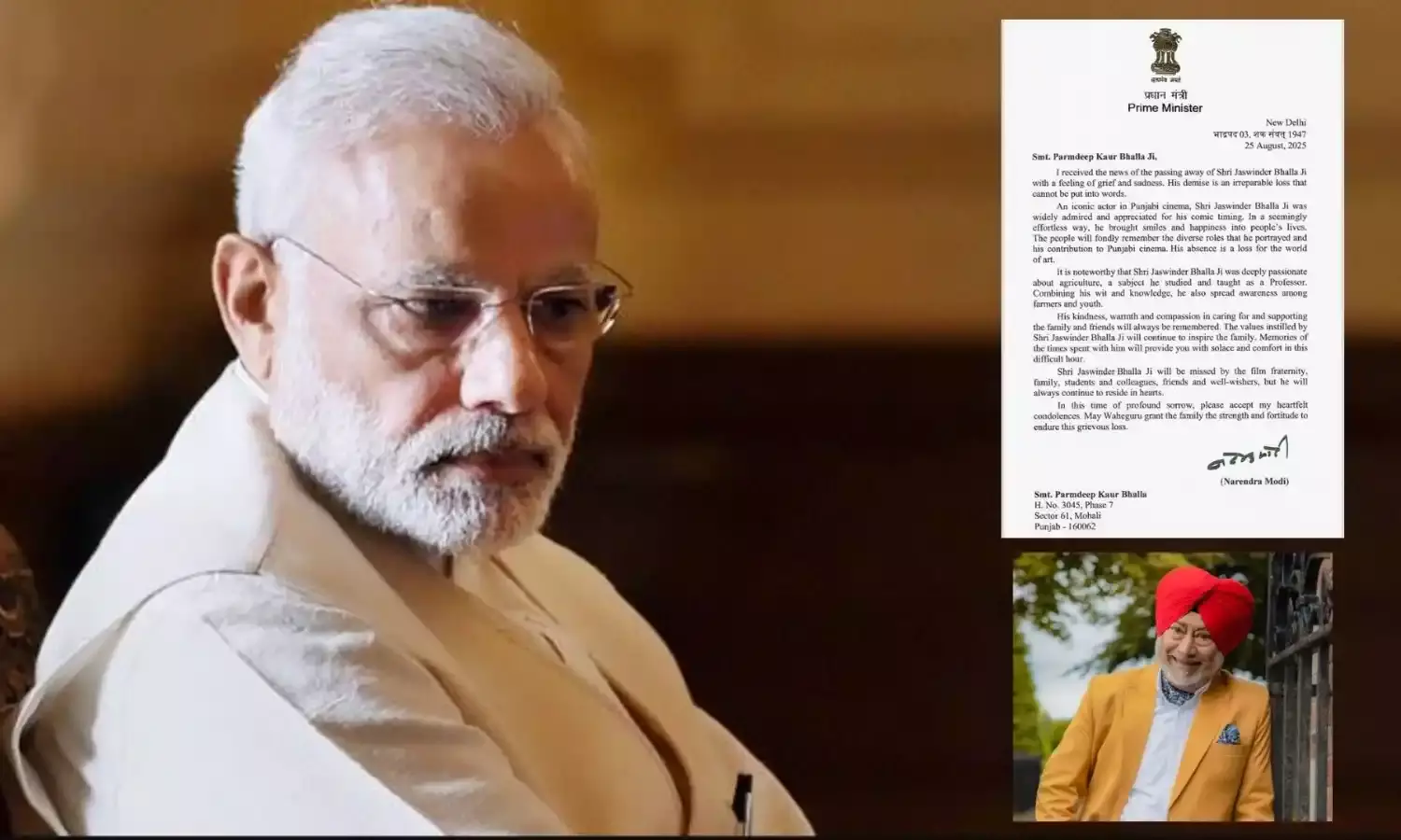 ਮਸ਼ਹੂਰ ਪੰਜਾਬੀ ਕਾਮੇਡੀਅਨ ਅਤੇ ਅਦਾਕਾਰ ਜਸਵਿੰਦਰ ਭੱਲਾ ਦਾ 22 ਅਗਸਤ ਨੂੰ ਦਿਹਾਂਤ ਹੋ ਗਿਆ। ਜਿਸਦੇ ਚਲਦੇ ਦੇਸ਼ ਦੇ ਪ੍ਰਧਾਨ ਮੰਤਰੀ ਨਰਿੰਦਰ ਮੋਦੀ ਵਲੋਂ ਵੀ ਦੁੱਖ ਦਾ ਪ੍ਰਗਟਾਵਾ ਕੀਤਾ ਗਿਆ। ਪੀਐਮ ਮੋਦੀ ਨੇ ਇੱਕ ਪੱਤਰ ਜਸਵਿੰਦਰ ਭੱਲਾ ਦੀ ਪਤਨੀ ਪਰਮਦੀਪ ਕੌਰ ਭੱਲਾ ਨੂੰ ਲਿੱਖਿਆ,