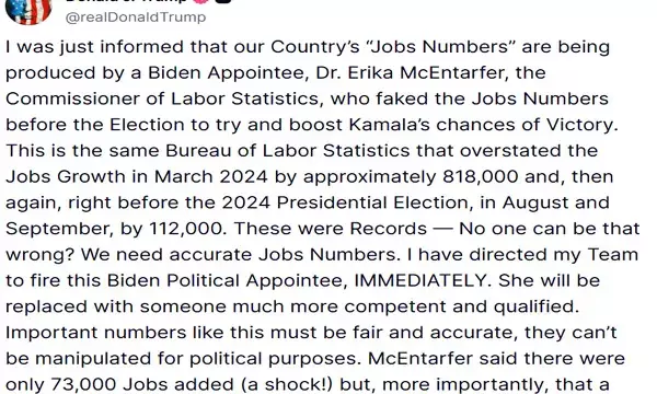 ਦੂਜੇ ਪਾਸੇ ਡੌਨਲਡ ਟਰੰਪ ਦਾ ਗੁੱਸਾ ਸੱਤਵੇਂ ਅਸਮਾਨ ’ਤੇ ਹੈ ਅਤੇ ਸੋਸ਼ਲ ਮੀਡੀਆ ਰਾਹੀਂ ਕਿਰਤ ਵਿਭਾਗ ਦੇ ਅੰਕੜਿਆਂ ਬਾਰੇ ਟਿੱਪਣੀ ਕਰਦਿਆਂ ਉਨ੍ਹਾਂ ਕਿਹਾ, ‘‘ਕੋਈ ਐਨਾ ਗਲਤ ਕਿਵੇਂ ਹੋ ਸਕਦਾ ਹੈ? ਅਸੀਂ ਬਿਲਕੁਲ ਦਰੁਸਤ ਅੰਕੜੇ ਚਾਹੁੰਦੇ ਹਾਂ ਅਤੇ ਮੈਂ ਆਪਣੀ ਟੀਮ ਨੂੰ ਹੁਕਮ ਦਿਤਾ ਹੈ ਕਿ ਜੋਅ ਬਾਇਡਨ ਵੱਲੋਂ ਨਿਯੁਕਤ ਅਫ਼ਸਰ ਅੰਕੜਾ ਇਕਾਈ ਦੀ ਕਮਿਸ਼ਨਰ ਐਰਿਕਾ ਮੈਕਨਟਾਰਫਰ ਨੂੰ ਤੁਰਤ ਬਰਖਾਸਤ ਕਰ ਦਿਤਾ ਜਾਵੇ।’’ ਟਰੰਪ ਨੇ ਅੱਗੇ ਕਿਹਾ ਕਿ ਹੁਣ ਵਧੇਰੇ ਯੋਗ ਅਫਸਰ ਲਿਆਂਦਾ ਜਾਵੇਗਾ ਤਾਂਕਿ ਦਰੁਸਤ ਅੰਕੜੇ ਸਾਹਮਣੇ ਆ ਸਕਣ ਅਤੇ ਇਨ੍ਹਾਂ ਨੂੰ ਸਿਆਸੀ ਮਕਸਦ ਵਾਸਤੇ ਤੋੜ ਮੋੜ ਕੇ ਪੇਸ਼ ਨਾ ਕੀਤਾ ਜਾ ਸਕੇ।’’