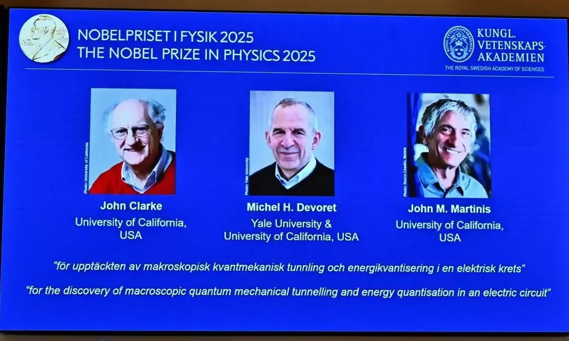 ਭੌਤਿਕ ਵਿਗਿਆਨ 2025 ਦਾ ਨੋਬਲ ਪੁਰਸਕਾਰ ਕੈਲੀਫੋਰਨੀਆ ਯੂਨੀਵਰਸਿਟੀ, ਬਰਕਲੇ ਦੇ ਜੌਨ ਕਲਾਰਕ, ਯੇਲ ਯੂਨੀਵਰਸਿਟੀ ਅਤੇ ਕੈਲੀਫੋਰਨੀਆ ਯੂਨੀਵਰਸਿਟੀ, ਸੈਂਟਾ ਬਾਰਬਰਾ ਦੇ ਮਿਸ਼ੇਲ ਐਚ. ਡੇਵੋਰੇਟ ਅਤੇ ਕੈਲੀਫੋਰਨੀਆ ਯੂਨੀਵਰਸਿਟੀ, ਸੈਂਟਾ ਬਾਰਬਰਾ ਦੇ ਜੌਨ ਐਮ. ਮਾਰਟਿਨਿਸ ਨੂੰ ਦਿੱਤਾ ਜਾਵੇਗਾ।