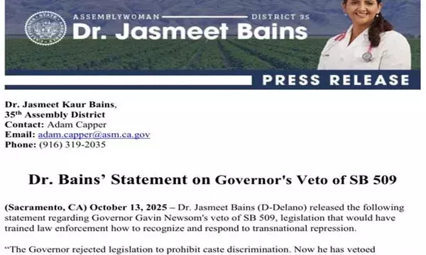 ਸੈਕਰਾਮੈਂਟੋ : ਕੈਲੇਫੋਰਨੀਆ ਵਿਚ ਵਸਦੇ ਸਿੱਖਾਂ ਨੂੰ ਵਿਦੇਸ਼ੀ ਤਾਕਤਾਂ ਤੋਂ ਸੁਰੱਖਿਅਤ ਰੱਖਣ ਦੇ ਮਕਸਦ ਨਾਲ ਸੂਬਾ ਅਸੈਂਬਲੀ ਅਤੇ ਸੈਨੇਟ ਵੱਲੋਂ ਪਾਸ ਬਿਲ ਐਸ.ਬੀ. 509 ਗਵਰਨਰ ਗੈਵਿਨ ਨਿਊਸਮ ਨੇ ਰੱਦ ਕਰ ਦਿਤਾ ਹੈ। ਬਿਲ ਪਾਸ ਕਰਵਾਉਣ ਵਿਚ ਅਹਿਮ ਕਿਰਦਾਰ ਨਿਭਾਉਣ ਵਾਲੀ ਡਾ. ਜਸਮੀਤ ਕੌਰ ਬੈਂਸ ਨੇ ਕਿਹਾ ਕਿ ਗਵਰਨਰ ਵੱਲੋਂ ਜਾਤ ਆਧਾਰਤ ਵਿਤਕਰਾ ਰੋਕਣ ਲਈ ਬਿਲ ਰੱਦ ਕੀਤਾ ਗਿਆ ਅਤੇ ਹੁਣ ਕੈਲੇਫੋਰਨੀਆ ਵਾਸੀਆਂ ਨੂੰ ਟ੍ਰਾਂਸਨੈਸ਼ਨਲ ਰਿਪ੍ਰੈਸ਼ਨ ਤੋਂ ਬਚਾਉਣ ਵਾਲੇ ਬਿਲ ਨੂੰ ਵੀ ਵੀਟੋ ਕਰ ਦਿਤਾ। ਸ਼ੁਕਰ ਹੈ ਕਿ 1984 ਦੀ ਸਿੱਖ ਨਸਲਕੁਸ਼ੀ ਨਾਲ ਸਬੰਧਤ ਮਤਾ ਪਾਸ ਕਰਵਾਉਣ ਲਈ ਗਵਰਨਰ ਦੇ ਦਸਤਖ਼ਤਾਂ ਦੀ ਜ਼ਰੂਰਤ ਨਹੀਂ ਪਈ। ਡਾ. ਜਸਮੀਤ ਕੌਰ ਬੈਂਸ ਨੇ ਅੱਗੇ ਕਿਹਾ, ‘‘ਸਿੱਖਾਂ ਨੂੰ ਆਪਣੀ ਆਵਾਜ਼ ਮਿਲ ਚੁੱਕੀ ਹੈ ਅਤੇ ਸੈਨੇਟਰ ਐਨਾ ਕੈਬਾਯੇਰੋ ਸਣੇ ਅਸੈਂਬਲੀ ਮੈਂਬਰ ਸੌਰੀਆ ਸਾਡੇ ਨਾਲ ਖੜੇ ਹਨ।