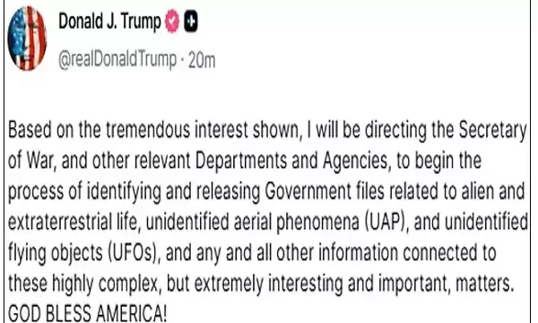 ਅਮਰੀਕਾ ਦੇ ਰਾਸ਼ਟਰਪਤੀ ਡੌਨਲਡ ਟਰੰਪ ਵੱਲੋਂ ਧਰਤੀ ਉਤੇ ਮੰਡਰਾਉਣ ਵਾਲੀਆਂ ਉਡਣ ਤਸ਼ਤਰੀਆਂ ਯਾਨੀ ਯੂ.ਐਫ਼.ਓਜ਼ ਅਤੇ ਏਲੀਅਨਜ਼ ਨਾਲ ਸਬੰਧਤ ਜਾਣਕਾਰੀ ਜਨਤਕ ਕਰਨ ਦੇ ਹੁਕਮ ਦਿਤੇ ਗਏ ਹਨ