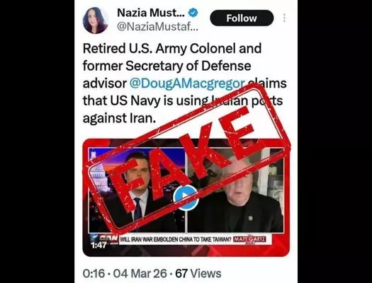 ਭਾਰਤੀ ਵਿਦੇਸ਼ ਮੰਤਰਾਲੇ ਦੇ ਅਧਿਕਾਰਤ ਤੱਥ-ਜਾਂਚ (Fact-Check) ਖਾਤੇ ਨੇ 'X' (ਪਹਿਲਾਂ ਟਵਿੱਟਰ) 'ਤੇ ਇੱਕ ਸਖ਼ਤ ਪੋਸਟ ਸਾਂਝੀ ਕਰਦਿਆਂ ਇਸ ਨੂੰ "ਨਿਰਆਧਾਰ" ਅਤੇ "ਮਨਘੜਤ" ਕਰਾਰ ਦਿੱਤਾ ਹੈ। ਮੰਤਰਾਲੇ ਨੇ ਸਪੱਸ਼ਟ ਕੀਤਾ ਕਿ ਅਮਰੀਕੀ ਜਲ ਸੈਨਾ ਭਾਰਤ ਦੇ ਕਿਸੇ ਵੀ ਠਿਕਾਣੇ ਦੀ ਵਰਤੋਂ ਈਰਾਨ ਵਿਰੁੱਧ ਨਹੀਂ ਕਰ ਰਹੀ। ਪੋਸਟ ਵਿੱਚ ਚੇਤਾਵਨੀ ਦਿੱਤੀ ਗਈ ਹੈ ਕਿ ਅਜਿਹੀਆਂ ਝੂਠੀਆਂ ਖ਼ਬਰਾਂ ਤੋਂ ਸਾਵਧਾਨ ਰਹਿਣ ਦੀ ਲੋੜ ਹੈ ਜੋ ਜਾਣਬੁੱਝ ਕੇ ਗਲਤਫਹਿਮੀਆਂ ਪੈਦਾ ਕਰਨ ਲਈ ਫੈਲਾਈਆਂ ਜਾ ਰਹੀਆਂ ਹਨ।