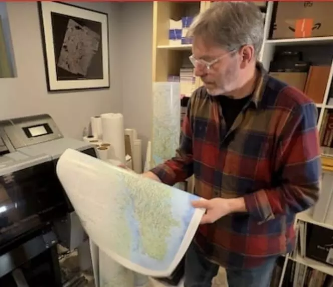 ਬ੍ਰਿਟਿਸ਼ ਕੋਲੰਬੀਆ ਦੇ ਨਕਸ਼ਾਨਵੀਸ ਜੈਫ਼ ਕਲਾਰਕ ਆਪਣੇ ਸਟੂਡੀਓ ਵਿੱਚ ਤਿਆਰ ਕੀਤਾ ਨਕਸ਼ਾ ਦਿਖਾਉਂਦੇ ਹੋਏ।