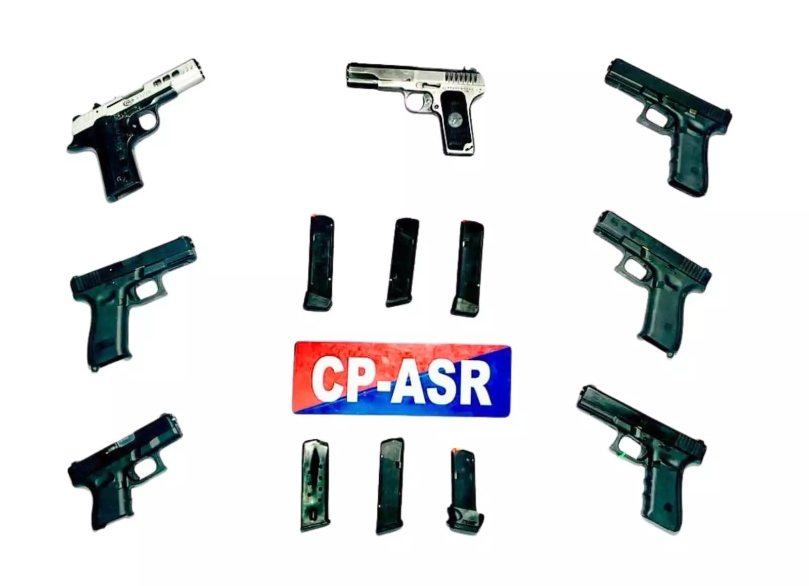 ਗ੍ਰਿਫ਼ਤਾਰ ਕੀਤੇ ਗਏ ਵਿਅਕਤੀਆਂ ਦੀ ਪਛਾਣ ਅੰਮ੍ਰਿਤਸਰ ਦੇ ਪਿੰਡ ਬੁਰਜ ਦੇ ਗੁਰਪ੍ਰੀਤ ਸਿੰਘ ਉਰਫ਼ ਗੋਪੀ (27), ਬਟਾਲਾ ਦੇ ਸੁੰਦਰ ਨਗਰ ਦੇ ਮਨੀਸ਼ ਕੁਮਾਰ ਉਰਫ਼ ਜੈਰੀ (24), ਅੰਮ੍ਰਿਤਸਰ ਦੇ ਪਿੰਡ ਚੂਚਕਵਾਲ ਦੇ ਸਰੂਪ ਸਿੰਘ ਉਰਫ਼ ਰੂਪ (27), ਅੰਮ੍ਰਿਤਸਰ ਦੇ ਪਿੰਡ ਫਤਿਹਪੁਰ ਰਾਜਪੂਤਾ ਦੇ ਚਮਕੌਰ ਸਿੰਘ (20) ਅਤੇ ਤਰਨਤਾਰਨ ਦੇ ਭਿਖੀਵਿੰਡ ਦੇ ਵੰਸ਼ ਸ਼ਰਮਾ (23) ਵਜੋਂ ਹੋਈ ਹੈ। ਬਰਾਮਦ ਕੀਤੇ ਗਏ ਹਥਿਆਰਾਂ ਵਿੱਚ ਪੰਜ 9 ਐਮ.ਐਮ. ਗਲੌਕ ਪਿਸਤੌਲ ਅਤੇ ਦੋ .30 ਬੋਰ ਪਿਸਤੌਲ ਸ਼ਾਮਲ ਹਨ।