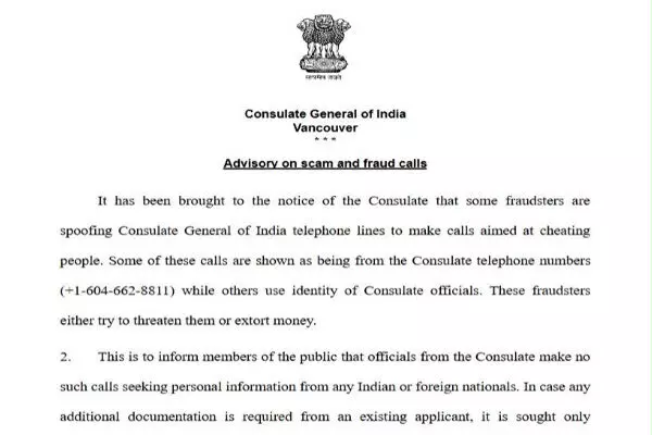 ਜੇ ਕਿਸੇ ਬਿਨੈਕਾਰ ਤੋਂ ਵਾਧੂ ਦਸਤਾਵੇਜ਼ਾਂ ਦੀ ਜ਼ਰੂਰਤ ਹੁੰਦੀ ਹੈ ਤਾਂ ਇਹ ਈਮੇਲ ਰਾਹੀਂ ਮੰਗੇ ਜਾਂਦੇ ਹਨ ਅਤੇ ਈਮੇਲ ਦਾ ਪਤਾ ‘ਐਟ ਐਮ.ਈ.ਏ. ਡਾਟ ਗੌਵ ਡਾਟ ਇਨ’ ਹੁੰਦਾ ਹੈ। ਕੌਂਸਲੇਟ ਮੁਤਾਬਕ ਠੱਗਾਂ ਵੱਲੋਂ ਕੀਤੀ ਕਾਲ ’ਤੇ ਟੈਲੀਫੋਨ ਨੰਬਰ 604 662 8811 ਨਜ਼ਰ ਆਉਂਦਾ ਹੈ ਜੋ ਕੌਂਸਲੇਟ ਨਾਲ ਸਬੰਧਤ ਹੈ ਪਰ ਠੱਗਾਂ ਵੱਲੋਂ ਤਕਨੀਕੀ ਦੀ ਦੁਰਵਰਤੋਂ ਕਰਦਿਆਂ ਆਪਣਾ ਉਲੂ ਸਿੱਧਾ ਕੀਤਾ ਜਾ ਰਿਹਾ ਹੈ। ਕੌਂਸਲੇਟ ਜਨਰਲ ਵੱਲੋਂ ਲੋਕਾਂ ਨੂੰ ਸੱਦਾ ਦਿਤਾ ਗਿਆ ਹੈ ਕਿ ਅਜਿਹੀ ਕਿਸੇ ਕਾਲ ਦਾ ਜਵਾਬ ਨਾ ਦਿਤਾ ਜਾਵੇ ਅਤੇ ਨਾ ਹੀ ਕੋਈ ਨਿਜੀ ਜਾਣਕਾਰੀ ਜ਼ਾਹਰ ਕੀਤੀ ਜਾਵੇ। ਇਸ ਤੋਂ ਇਲਾਵਾ ਜੇ ਕੋਈ ਰਕਮ ਦੀ ਮੰਗ ਕਰਦਾ ਹੈ ਤਾਂ ਸਿੱਧੇ ਤੌਰ ’ਤੇ ਨਕਾਰ ਦਿਤਾ ਜਾਵੇ। ਵਾਰ ਵਾਰ ਅਜਿਹੀਆਂ ਕਾਲਜ਼ ਆਉਣ ਦੀ ਸੂਰਤ ਵਿਚ ਪੁਲਿਸ ਨਾਲ ਸੰਪਰਕ ਕੀਤਾ ਜਾ ਸਕਦਾ ਹੈ। ਇਥੇ ਦਸਣਾ ਬਣਦਾ ਹੈ ਕਿ ਪਿਛਲੇ ਸਮੇਂ ਦੌਰਾਨ ਠੱਗਾਂ ਵੱਲੋਂ ਵੈਨਕੂਵਰ ਪੁਲਿਸ ਵਿਭਾਗ ਦੇ ਅਫ਼ਸਰ ਬਣ ਕੇ ਫੋਨ ਕੀਤੇ ਜਾ ਰਹੇ ਹਨ ਅਤੇ ਨਿਜੀ ਜਾਣਕਾਰੀ ਤੋਂ ਇਲਾਵਾ ਰਕਮ ਦੀ ਮੰਗ ਵੀ ਕੀਤੀ ਗਈ।