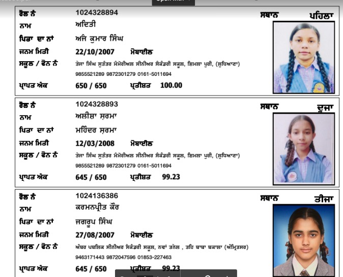 PSEB ਦੇ ਨਤੀਜੇ ਵਿਚ ਆਦਿਤੀ ਪੁੱਤਰੀ ਅਜੇ ਕੁਮਾਰ ਸਿੰਘ ਨੇ ਪਹਿਲਾ ਸਥਾਨ ਹਾਸਲ ਕੀਤਾ ਹੈ। ਅਲੀਸ਼ਾ ਪੁੱਤਰੀ ਮਹਿੰਦਰ ਸ਼ਰਮਾ ਨੇ ਦੂਜਾ ਸਥਾਨ ਹਾਸਲ ਕੀਤਾ, ਕਰਮਲਪ੍ਰੀਤ ਕੌਰ ਪੁੱਤਰੀ ਜਗਰੂਪ ਸਿੰਘ ਨੇ ਤੀਜਾ ਸਥਾਨ ਹਾਸਲ ਕੀਤਾ ਹੈ।