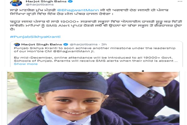 ਹਰਜੋਤ ਸਿੰਘ ਬੈਂਸ ਨੇ ਪੋਸਟ ਸਾਂਝੀ ਕਰਦੇ ਹੋਏ ਕੀਤਾ ਦਸੰਬਰ ਦੇ ਅੱਧ ਤੱਕ ਸਾਰੇ 19 ਹਜ਼ਾਰ ਤੋਂ ਵੱਧ ਸਰਕਾਰੀ ਸਕੂਲਾਂ ਲਈ ਆਨਲਾਈਨ ਹਾਜ਼ਰੀ ਸ਼ੁਰੂ ਕਰ ਦਿੱਤੀ ਜਾਵੇਗੀ। ਪੰਜਾਬ ਦੇ ਪ੍ਰਾਈਵੇਟ ਸਕੂਲਾਂ ਵਾਂਗ, ਸਰਕਾਰੀ ਸਕੂਲਾਂ ਵਿੱਚ ਪੜ੍ਹ ਰਹੇ ਵਿਦਿਆਰਥੀਆਂ ਦੇ ਮਾਪਿਆਂ ਨੂੰ ਉਨ੍ਹਾਂ ਦੇ ਬੱਚੇ ਗੈਰ ਹਾਜ਼ਰ ਹੋਣ ’ਤੇ ਐਸਐਮਐਸ ਅਲਰਟ ਪ੍ਰਾਪਤ ਕਰਨਗੇ।